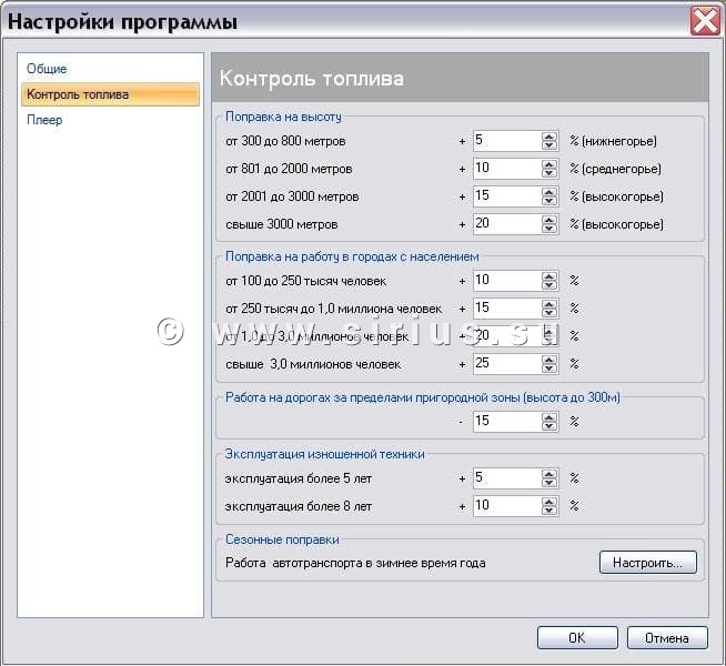 В меню «Контроль топлива» вы найдете рекомендуемые показатели поправочных коэффициентов, которые увеличивают или понижают расчетный расход горючего. Эти показатели можно менять в зависимости от учетной политики предприятия.
